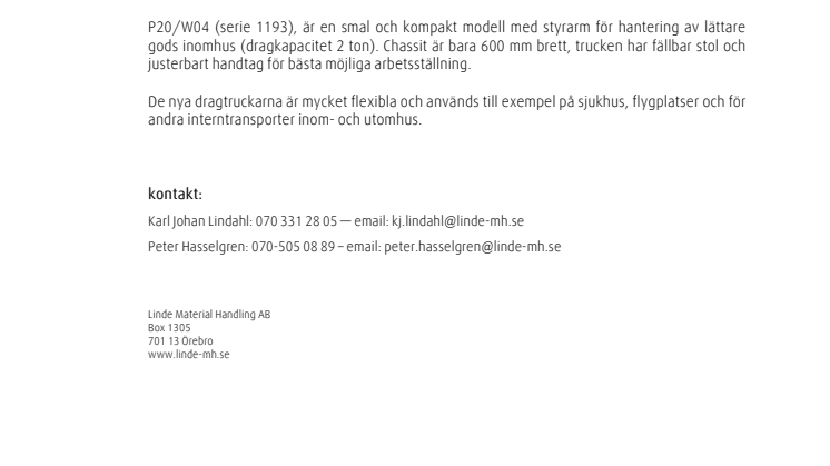 Peter Hasselgren: 070-505 08 89 – email: peter.hasselgren@linde-mh.se