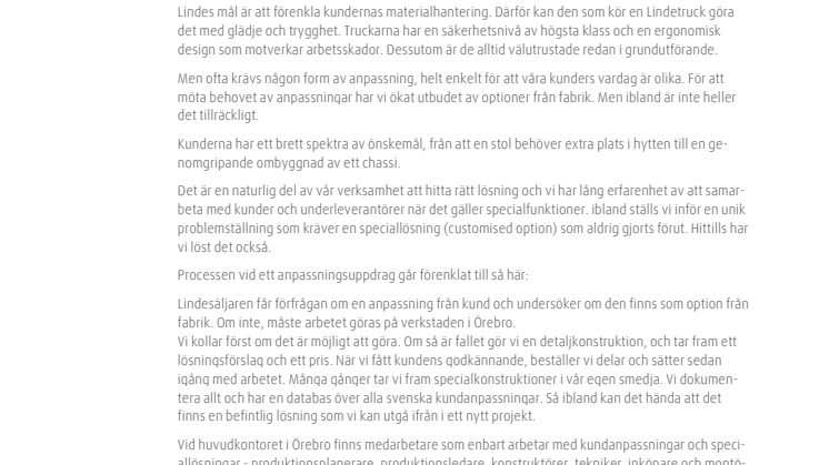 Det är en naturlig del av vår verksamhet att hitta rätt lösning och vi har lång erfarenhet av att samarbeta med kunder och underleverantörer när det gäller specialfunktioner. ibland ställs vi inför en unik problemställning som kräver en speciallösning (customised option) som aldrig gjorts förut. Hittills har vi löst det också.