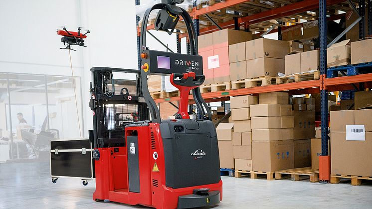 Under sin inventeringsrunda leder Lindes automatiserade pallstaplare L-MATIC vägen för drönaren. De två fordonen är synkroniserade via en spänningsomvandlare och självjusterande kabel. Genom denna unika koppling har Linde löst två problem som hittills förhindrat användandet av drönare på lager: strömtillförsel (ett drönarbatteri räcker i snitt endast 15 minuter) och lokaliseringen i byggnader som saknar GPS-mottagning. Tack vare den geonavigationsteknologi Linde använder i sina automatiserade truckar vet systemet exakt vart drönaren befinner sig.