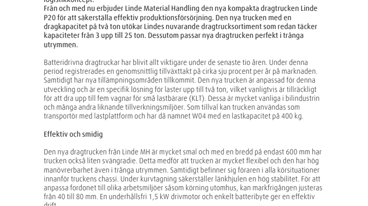 Från och med nu erbjuder Linde Material Handling den nya kompakta dragtrucken Linde P20 för att säkerställa effektiv produktionsförsörjning. Den nya trucken med en dragkapacitet på två ton utökar Lindes nuvarande dragtrucksortiment som redan täcker kapaciteter från 3 upp till 25 ton. Dessutom passar nya dragtrucken perfekt i trånga utrymmen.