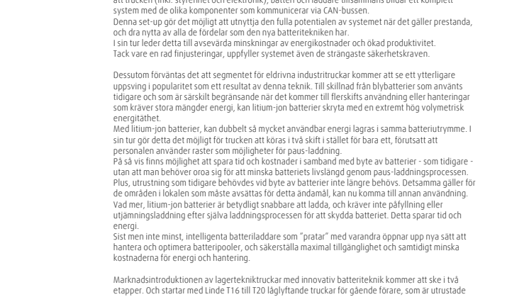 Marknadsintroduktionen av lagertekniktruckar med innovativ batteriteknik kommer att ske i två etapper och startar med Linde T16 till T20 låglyftande truckar för gående förare, som är utrustade med ett 86-Ah batteri. Dessutom är denna spänning levererad jämnt över hela driftsperioden, hela vägen igenom tills strax innan batteriet når urladdningsstatus. Batteriet laddas upp i en och en halv timme, och så mycket som 60% på 30 minuter. Vid 1.97 kWh, är den installerade effekten i drivmotorn klart över den tidigare enheten som standard.