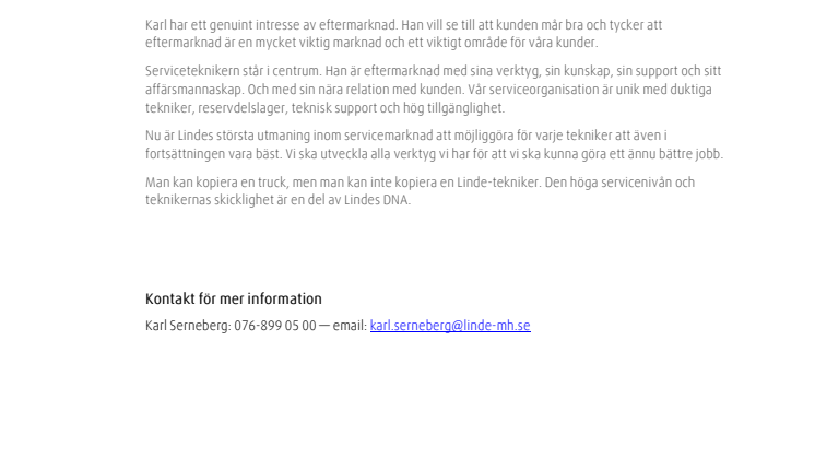 Nu är Lindes största utmaning inom servicemarknad att möjliggöra för varje tekniker att även i fortsättningen vara bäst. Vi ska utveckla alla verktyg vi har för att vi ska kunna göra ett ännu bättre jobb.