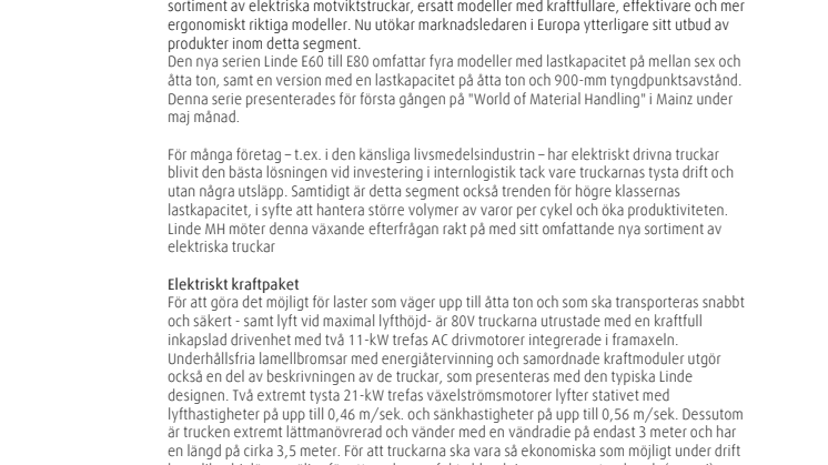 Den nya serien Linde E60 till E80 omfattar fyra modeller med lastkapacitet på mellan sex och åtta ton, samt en version med en lastkapacitet på åtta ton och 900-mm tyngdpunktsavstånd. Denna serie presenterades för första gången på "World of Material Handling" i Mainz under maj månad.