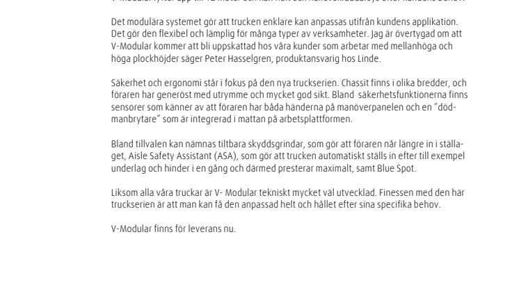Det modulära systemet gör att trucken enklare kan anpassas utifrån kundens applikation. Det gör den flexibel och lämplig för många typer av verksamheter. Jag är övertygad om att V-Modular kommer att bli uppskattad hos våra kunder som arbetar med mellanhöga och höga plockhöjder säger Peter
