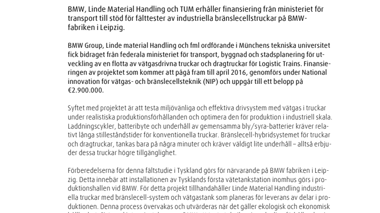 BMW Group, Linde material Handling och fml ordförande i Münchens tekniska universitet fick bidraget från federala ministeriet för transport, byggnad och stadsplanering för utveckling av en flotta av vätgasdrivna truckar och dragtruckar för Logistic Trains. Finansieringen av projektet som kommer att