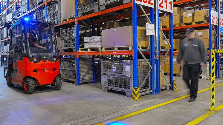 Linde TruckSpot finns tillgängligt för nya truckar men kan också enkelt eftermonteras. Systemet kan också kombineras med Linde Bluespot.