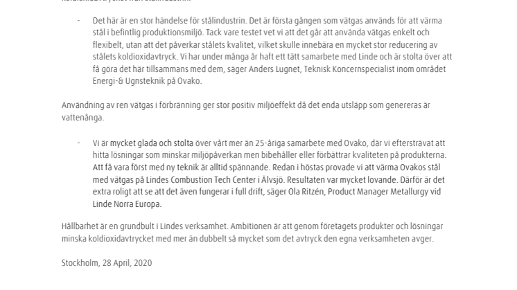 - Vi är mycket glada och stolta över vårt mer än 25-åriga samarbete med Ovako, där vi eftersträvat att hitta lösningar som minskar miljöpåverkan men bibehåller eller förbättrar kvaliteten på produkterna. Att få vara först med ny teknik är alltid spännande. Redan i höstas provade vi att värma Ovakos stål med vätgas på Lindes Combustion Tech Center i Älvsjö. Resultaten var mycket lovande. Därför är det extra roligt att se att det även fungerar i full drift, säger Ola Ritzén, Product Manager Metallurgy vid Linde Norra Europa.
