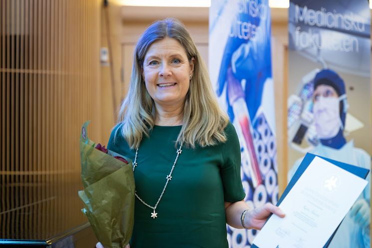 Karin Åkesson, mottagare av stipendium från Joanna Cocozzas stiftelse för barnmedicinsk forskning 2023. Utdelning på Medicinska fakultetens fakultetskollegium 14 december 2023.