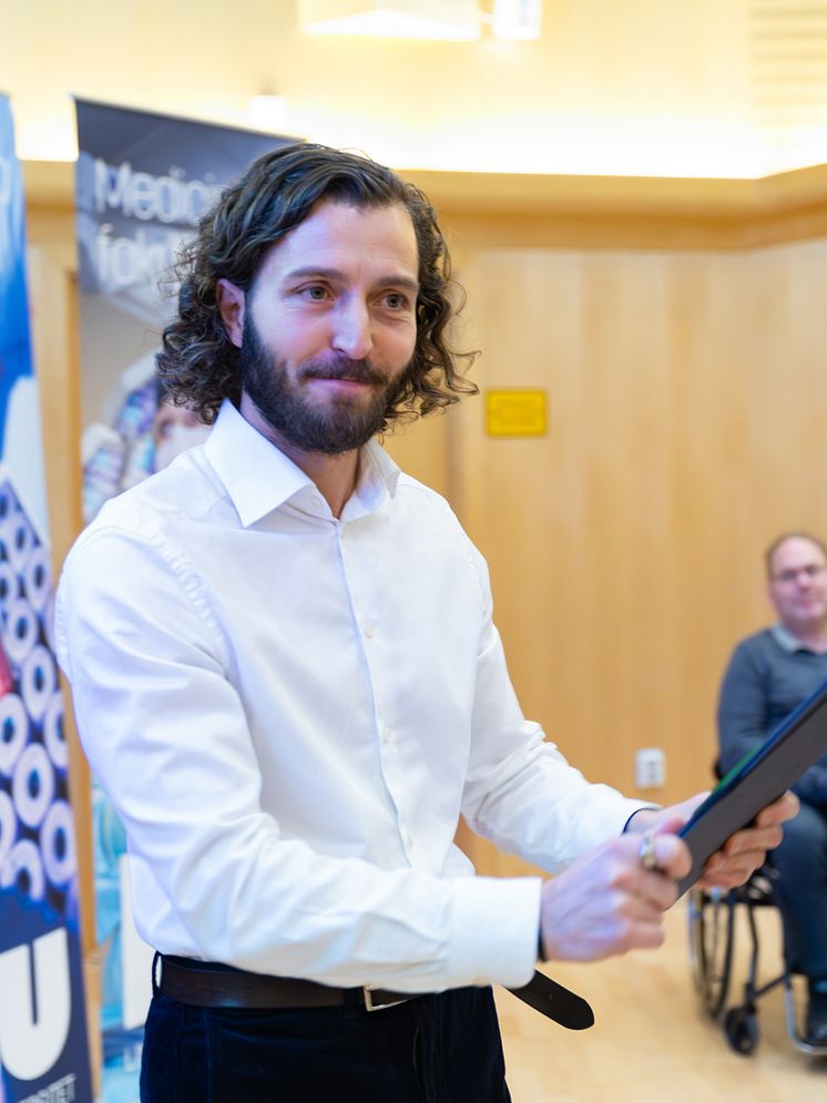 Claudio Cantù, mottagare av stipendium från Joanna Cocozzas stiftelse för barnmedicinsk forskning 2023. Utdelning på Medicinska fakultetens fakultetskollegium 14 december 2023.