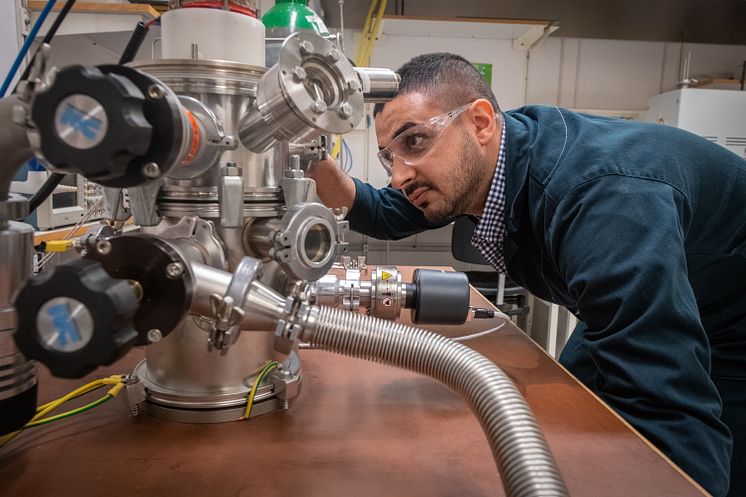 Hama Nadhom justerar gasflödet till vakuumkammaren där LiU-forskarna studerar hur plasmaelektroner kan användas för att skapa tunna metallfilmer.