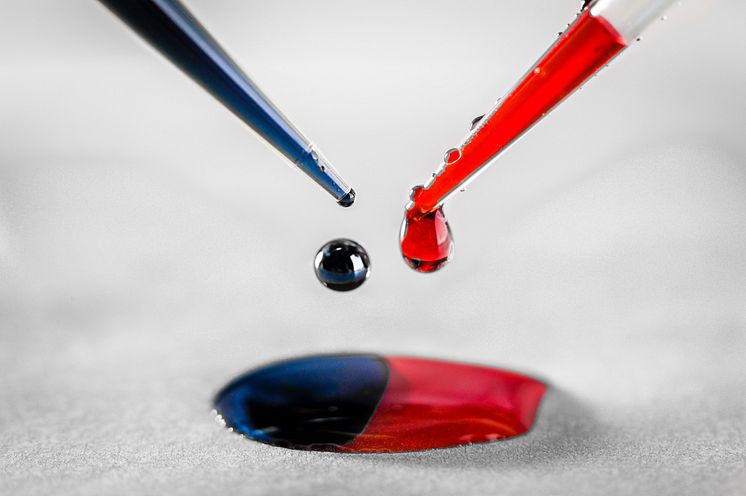Den blå lösningen är den polymer som donerar elektroner medan den röda är det material som tar upp elektroner. Inget av dem är ledande i sin grundform, när de blandas samman övergår elektroner automatiskt från den blå donatorpolymeren till den röda acceptor-polymeren. Resultatet är fria rörliga laddningar i båda polymererna.