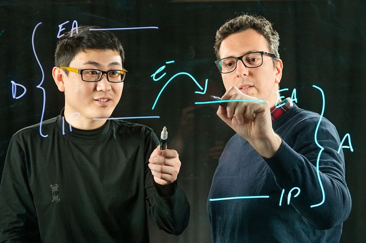 Energinivåerna i de båda materialen är perfekt anpassade till varandra vilket innebär att laddningar spontant förflyttar sig från den ena polymeren till den andra. Kai Xu och Simone Fabiano visar.
