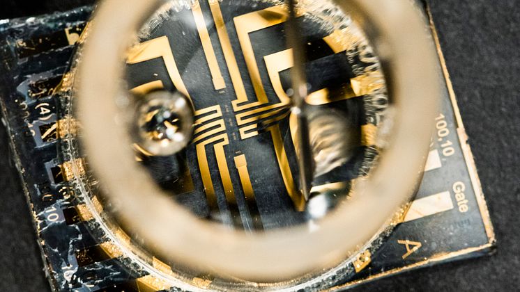 Den organiska elektrokemiska transistorn där forskarna skapat en syrefri miljö och fått Shewanella oneidensis att deponeras på den ena mikroelektroden.