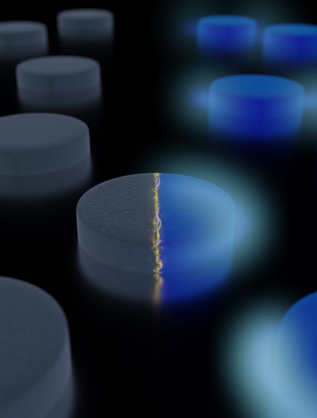 Miljarder nanodiskar deponeras på en kvadratcentimeter stor yta. Var och en av dem reagerar på det infallande ljuset och skapar plasmoner.