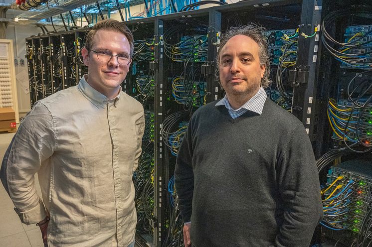 På superdatorerna vid Nationellt superdatorcentrum vid Linköpings universitet simulerar forskare hur atomer i olika material beter sig. Data ifrån sådana simulationer görs tillgänglig över hela världen via standarden OPTIMADE för att träna framtidens AI-modeller för materialforskning. Från vänster: Oskar Andersson, doktorand, och Rickard Armiento, universitetslektor, vid Linköpings universitet.
