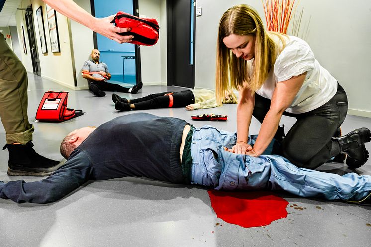 Vid en skadehändelse med flera skadade behöver de som är på plats samarbeta. Några kan behöva använda sina händer för att bromsa blödning med direkt tryck, samtidigt som andra hämtar utrustning och larmar 112.