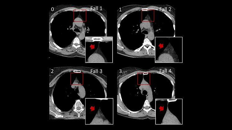 Thymusvävnad är ljus medan fettvävnad är mörk vid datortomografi. Här ses olika grader av fettomvandling av thymus, från helt fettomvandlad (0) till mestadels bevarad thymusvävnad (3).