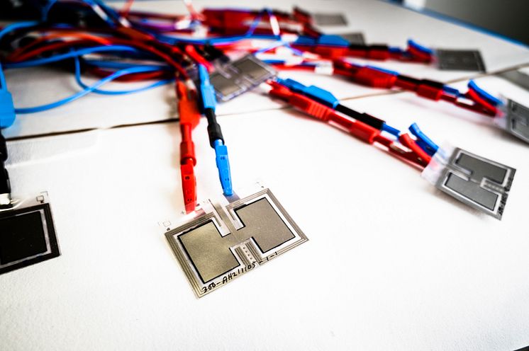 Tryckta batterier med två celler, designad i samarbete med företaget Ligna Energy.
