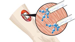 Illustration: Det kemiska chipet kan exempelvis styra leveransen av neurotransmittorn acetylkolin. Muskeln aktiveras när den kommer i kontakt med acetylkolin. Illustration: Ingemar Franzén