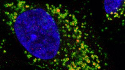 Bild: Mänsklig nervcell (neuroblastomcell) med cellkärnan i blått, beta-amyloid som röda aggregat inuti grönfärgade lysosomer. Foto: Lotta Agholme.