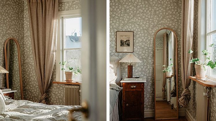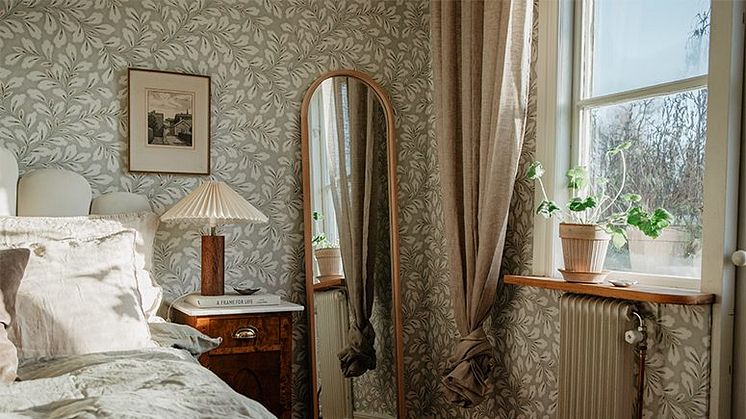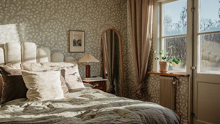 När jag gjorde om vårt sovrum började jag med att välja tapeten. Det är Boråstapeters ”Liv” som pryds av ett bladverk med folkloristisk känsla. Den har en dämpad dimgrön nyans med inslag av blek terracotta. Eftersom det händer lite i tapeten valde jag att ha gardinen INTERMEZZO i 100% linne i färgen ”mullvadsbrun” till. Den är verkligen helt fantastisk och jag dras alltid till jordnära färger, det är som att dessa färger får mig att känna mig jordad, lugn och mer närvarande i nuet. Att byta ut sina gardiner är en så enkel sak att göra och ger rummet en helt ny känsla. Ett tips är att försöka fånga upp färgerna i gardinerna i andra textilier i rummet så som i kuddar, plädar eller liknande.