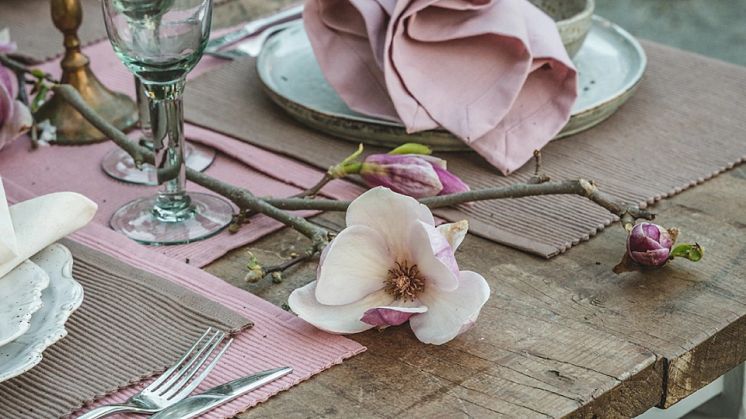 ”LINUMS klassiska UNI-serie i 100% bomull gör det enkelt att skapa en inbjudande dukning som speglar årstidens färger och naturens skönhet. I min dukning använde jag mig av grenar från min magnolia som blommar i trädgården för första gången. LINUMS produkter är inte bara vackra utan också praktiska och hållbara, vilket gör dem till ett utmärkt val för både vardag och fest, tipsar Mari”.