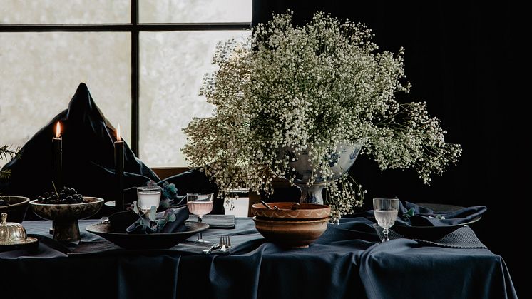 Vi har också valt att kombinera BIANCA med PAOLO bomullssammet, då PAOLO ger en vacker lyster till BIANCAS mer matta yta. Kuddfodralen SILK och SETA ger samma effekt, men vi rekommenderar verkligen att jobba med ton-ton, för en sofistikerad look. Alla textilier i vår styling har samma färgkod eller närliggande färgkod, just för att få en så uttrycksfull dukning som möjligt. I den här dukningen är det just Bläckblå (C54) som får ta för sig.