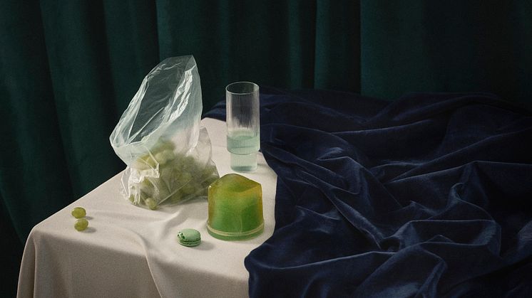 Valet av gardinernas färg är medvetet och syftet har varit att skapa en naturlig kontrast för att bygga en scenografi i olika lager. Jag ville ha en modern syn på de klassiska ”natura morta” -målningarna. De vanliga valen av element som frukt, druvor och bestick fick lämna utrymme till något udda och ovanligt. Stylist Camilla Gantelius, kunde välja att använda stödet för att ge bilderna rätt komplement för att skapa en annorlunda disposition. Gardinerna i PAOLO- serien var fantastiska att arbeta med. Tygets mjukhet och hur den naturliga lystern reagerade på ljuset, fick dem nästan att se helt levande ut.