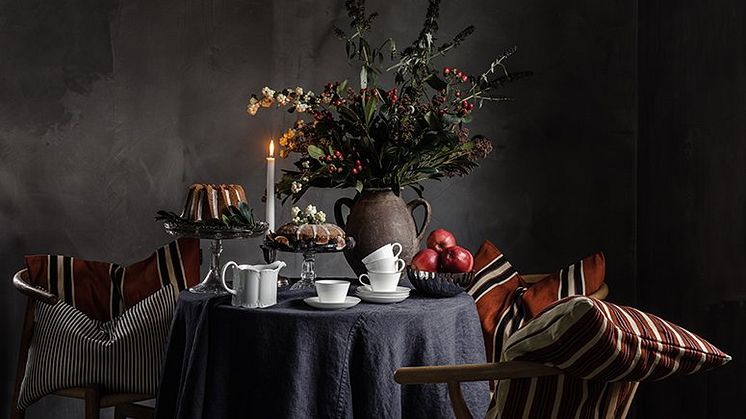 I vår dukning får gärna färger och kvaliteter tala. Det behöver inte vara så tillrättalagt. En rynka på bordsduken är bara vackert, liksom en lite slarvigt ihoprullad servett. Våra kuddar vilar avspänt på stolarna och i blomsterarrangemangen är det kreativiteten som får ta mest plats, inte perfektionen. Det ska vara bekvämt att gå till bords, enkelt att tvätta och smidigt att duka av och på. Julen ska inte bara vara god, utan också helt utan krav.
