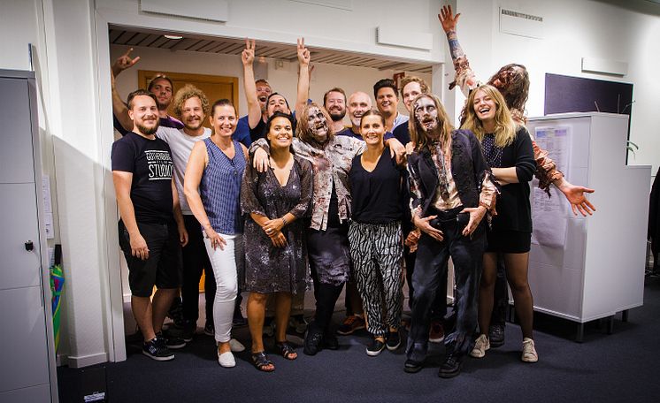 Glad arbetsgrupp från DDB, Liseberg, Always Frank och Hello There efter en lång arbetsdag i mörkret.