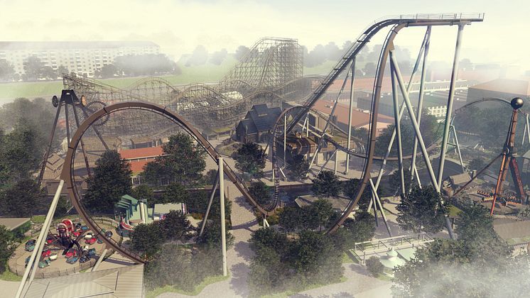 Valkyria with the Gyro Swing Loke, to the left and the wooden coaster Balder in the background.