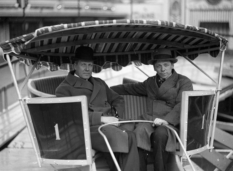 Till vänster sitter Lisebergsstyrelsens kassaförvaltare, direktör Osvald Arnulf-Olsson. Till höger om honom kamrat Adamson.