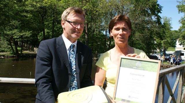 Kent Kierdorf, vd, och Marie Sellin Larsson, miljöansvarig på Lisebergs Gäst AB visar upp miljödiplom och tårta.