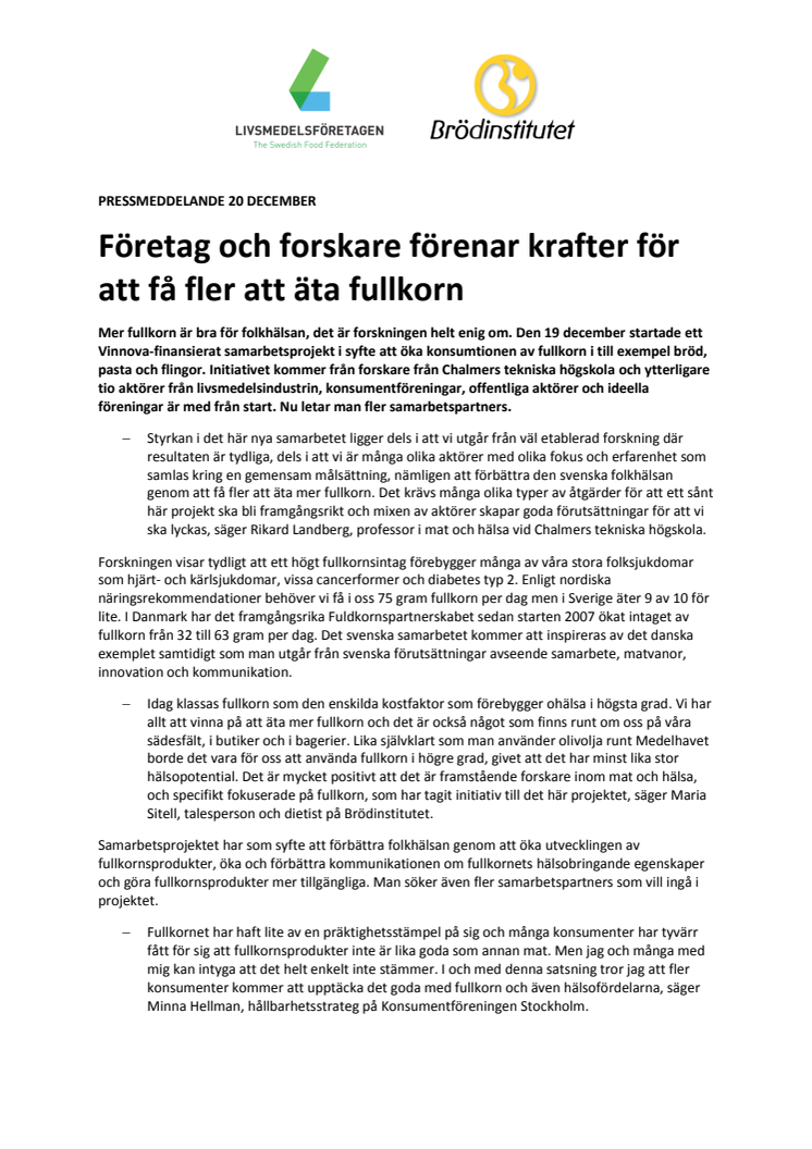 Mer fullkorn är bra för folkhälsan, det är forskningen helt enig om. Den 19 december startade ett Vinnova-finansierat samarbetsprojekt i syfte att öka konsumtionen av fullkorn. Initiativet kommer från forskare från Chalmers tekniska högskola och ytterligare tio aktörer från livsmedelsindustrin, konsumentföreningar, offentliga aktörer och ideella föreningar är med från start.