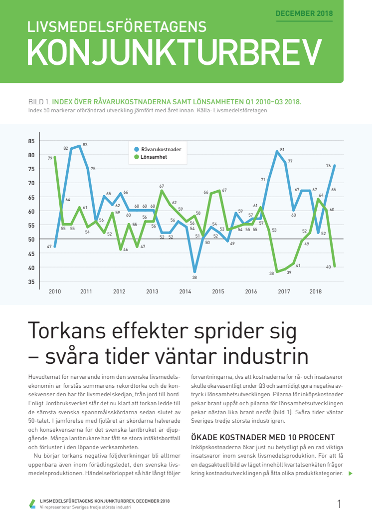 Som en följd av den värsta torkan i modern tid har livsmedelsindustrins inköpskostnader ökat med i snitt 10%. Priset på enskilda insatsvaror har ökat långt mer. Vart fjärde företag som köper in spannmålsbaserade råvaror uppger att kostnaderna har ökat med mer än 30%. Om inte konsumentpriserna på svenskproducerad mat ökar med i genomsnitt 5% riskerar många företag att få lägga ner.