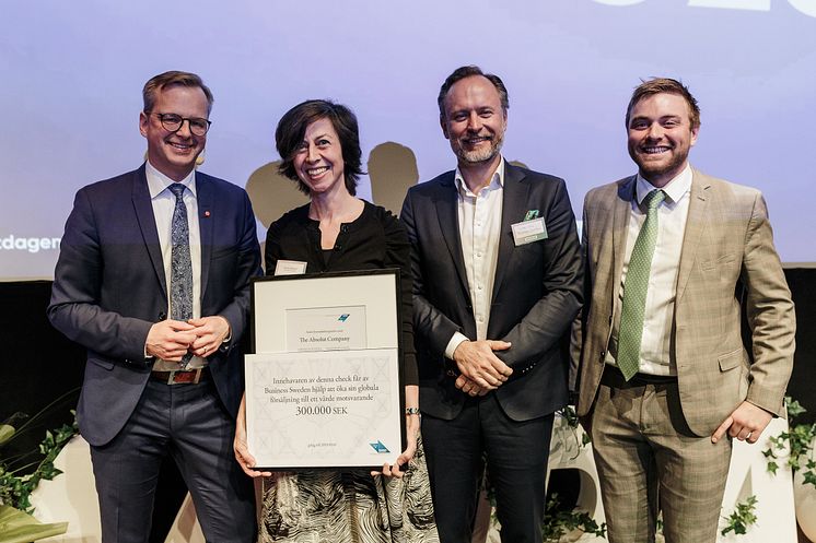 Årets Livsmedelsexportör 2018 blev The Absolut Company. Kommunikationschef Paula Eriksson tog emot priset på Matdagen 2018. På bilden även näringsminister Mikael Damberg, Fredrik Fexe från Business Sweden och Rasmus Bäckström från Livsmedelsföretagen.