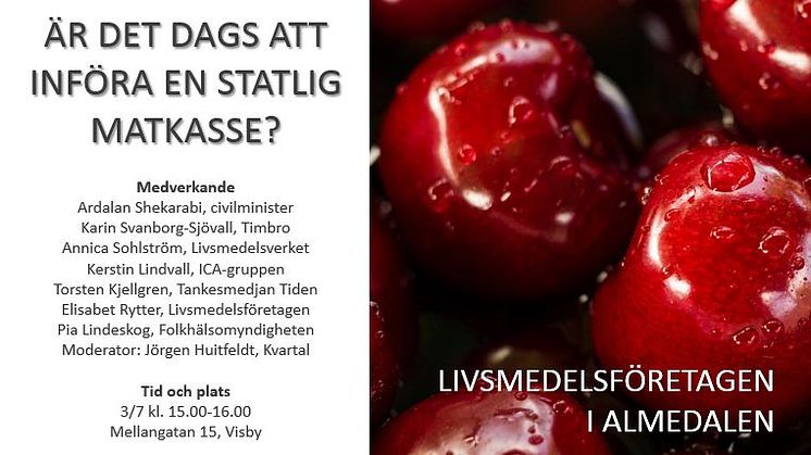 Seminariet äger rum den 3 juli kl 15.00-16.00 i Livsmedelsföretagens trädgård i Almedalen. Seminariet kommer att inledas med att Pia Lindeskog från Folkhälsomyndigheten gör en kort sammanfattning av slutsatserna i de två rapporterna ”Förslag till åtgärder för ett stärkt, långsiktigt arbete för att främja hälsa relaterad till matvanor och fysisk aktivitet” (Folkhälsomyndigheten, maj 2017) och ”Uppdraget att utreda hur den offentliga styrningen för att främja hälsosamma matvanor kan stärkas” (Statskontoret, maj 2019).
