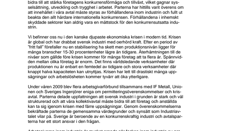 Under våren 2009 blev flera arbetsgivarförbund tillsammans med IF Metall, Unionen och Sveriges Ingenjörer eniga om permitteringsöverenskommelser och krisavtal. Parterna delade uppfattningen att svensk industri i grunden är stark och väl strukturerad och att våra kollektivavtal måste bidra till att företag och anställda kan ta sig igenom krisen med färre uppsägningar. Genom överenskommelserna bekräftade parterna de gemensamma värdegrunder och synsätt som Industriavtalet vilar på. Sverige är beroende av en konkurrenskraftig industri och avtalsparterna har ett stort ansvar i den frågan.