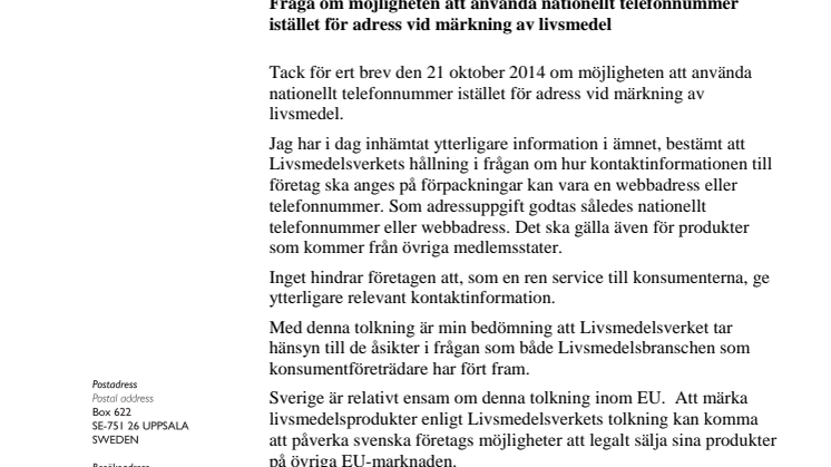 Brevet från Livsmedelsverket finns att ladda ner nedan (pdf)
