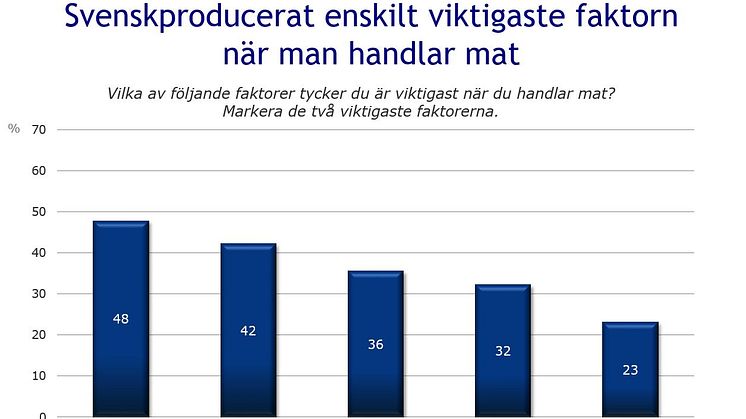 Hälften av de svarande valde "Att maten är svenskproducerad" som ett av de två alternativen. Näst viktigast är att maten är hälsosam.