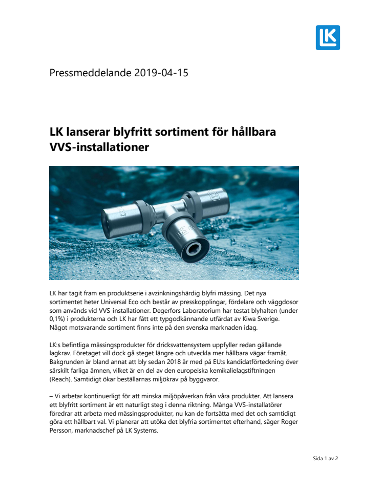 LK har tagit fram en produktserie i avzinkningshärdig blyfri mässing. Det nya sortimentet heter Universal Eco och består av presskopplingar, fördelare och väggdosor som används vid VVS-installationer.