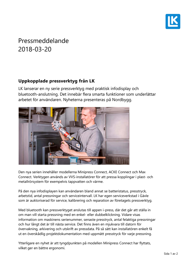 LK lanserar en ny serie pressverktyg med praktisk infodisplay och bluetooth-anslutning. Det innebär flera smarta funktioner som underlättar arbetet för användaren. Nyheterna presenteras på Nordbygg.