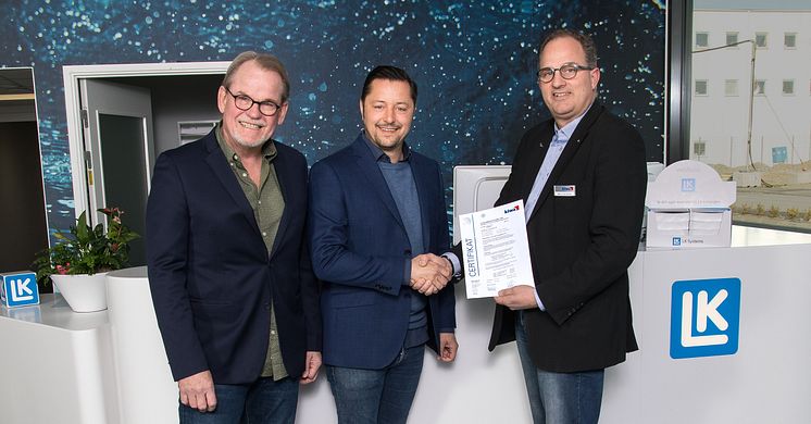 Produkterna i LK:s blyfria sortiment har fått ett typgodkännande (nr TG1550) utfärdat av Kiwa Sverige. Från vänster: Mats Åström (LK), Mattias Wideheim (LK), Marco van Brink (Kiwa)