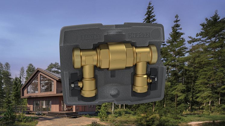 Ventilkombinationen inkluderar en backventil för att säkerställa korrekt riktning av vätskeflödet. För kompatibel shuntgrupp, se LK HydronicGroup 90C.