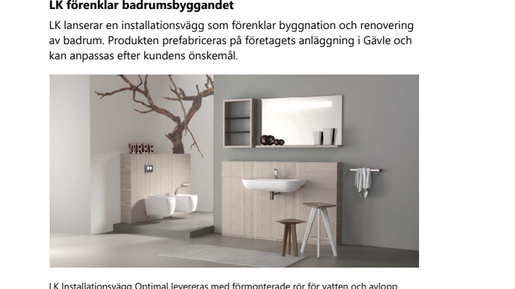 LK lanserar en installationsvägg som förenklar byggnation och renovering av badrum. Produkten prefabriceras på företagets anläggning i Gävle och kan anpassas efter kundens önskemål.