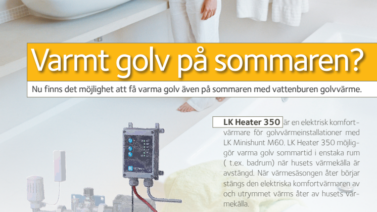 LK Heater 350 är en elektrisk komfortvärmare för golvvärmeinstallationer med LK Minishunt M60. LK Heater 350 möjliggör varma rum sommartid i enstaka rum (t.ex. badrum) när husets värmekälla är avstängd. När värmesäsongen åter börjar stängs den elektriska komfortvärmaren av och utrymmet värm åter av husets värmekälla.