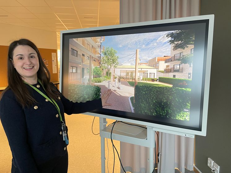 Diana Paunovic är byggprojektledare på LKF och ansvarig projektledare för Kanalgårdarna. Här visar hon en visionsbild på en av innergårdarna.