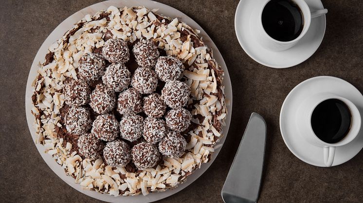 Baka med överblivet kaffe. Här är ett recept på en festlig chokladbollstårta från vännerna på Löfbergs där det funkar alldeles utmärkt att använda gårdagens kaffe som du förvarat i kylen.
