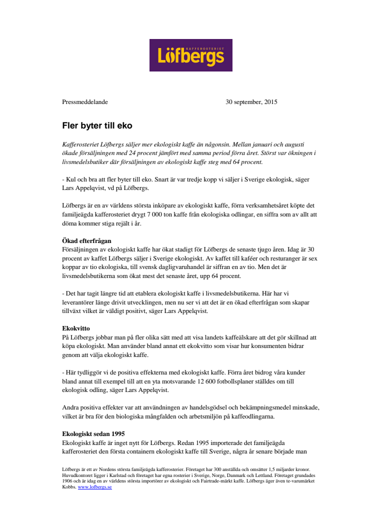 Kafferosteriet Löfbergs säljer mer ekologiskt kaffe än någonsin. Mellan januari och augusti ökade försäljningen med 24 procent jämfört med samma period förra året. Störst var ökningen i livsmedelsbutiker där försäljningen av ekologiskt kaffe steg med 64 procent.