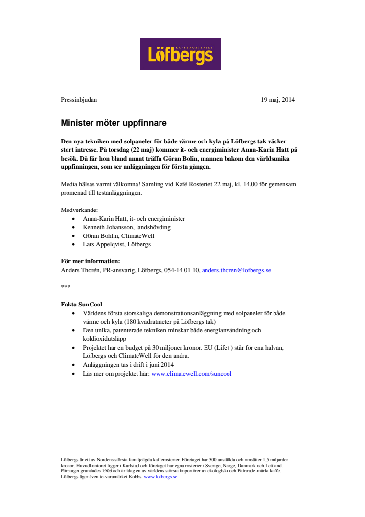 Den nya tekniken med solpaneler för både värme och kyla på Löfbergs tak väcker stort intresse. På torsdag (22 maj) kommer it- och energiminister Anna-Karin Hatt på besök. Då får hon bland annat träffa Göran Bolin, mannen bakom den världsunika uppfinningen, som ser anläggningen för första gången. Media är varmt välkomna!